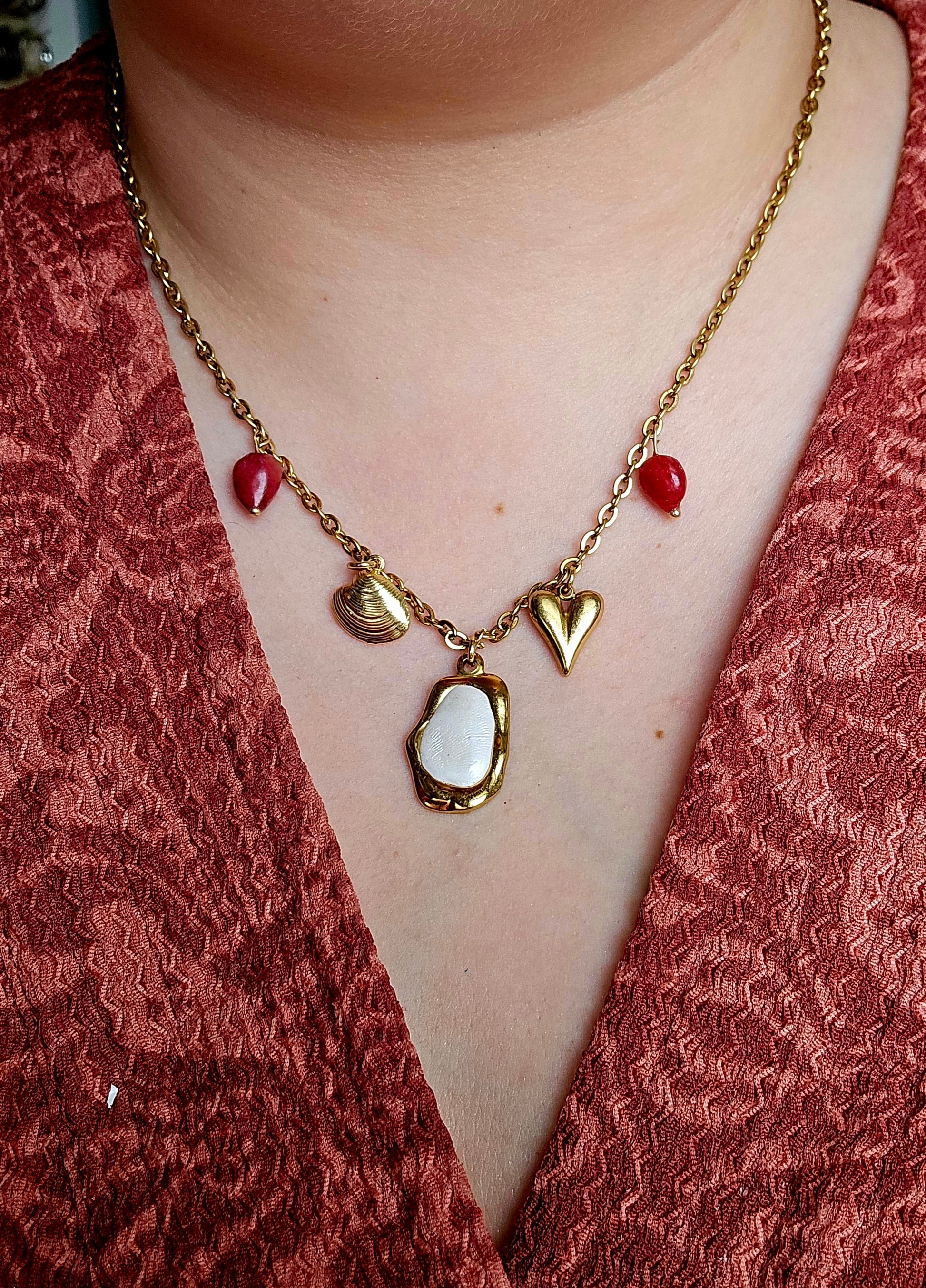 Collier à charms assemblé à la main, composé d’une chaîne et d’apprêts en acier inoxydable, agrémenté de charms mêlant créations en argile polymère faites main et éléments en acier inoxydable.